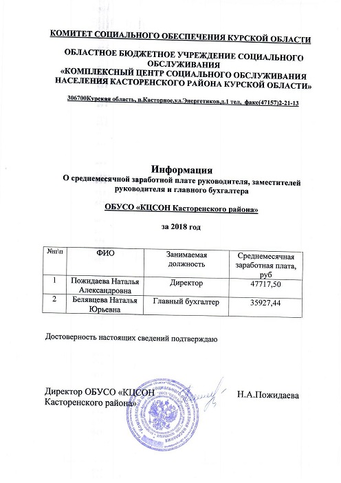 Директор ОБУСО «КЦСОН Касторенского района» - Пожидаева Наталья Александровна, 1977 г.р., образование высшее. В 2000 году закончила Воронежский государственный педагогический университет по специальности «Математика»; в 2013 году получила диплом о профессиональной переподготовке на право ведения профессиональной деятельности в сфере менеджмента социальной сферы.